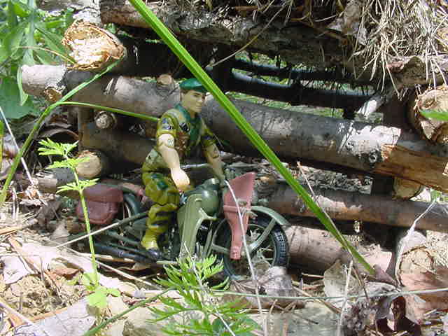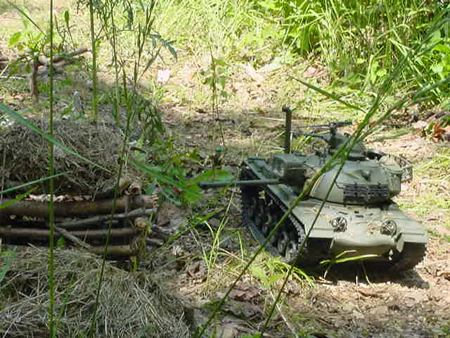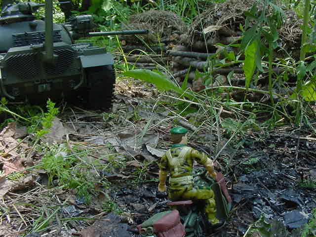 P73. The M48 moves behind another hut, while Bruce moves up in front the hut.
