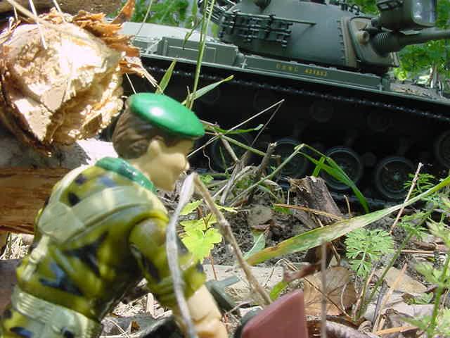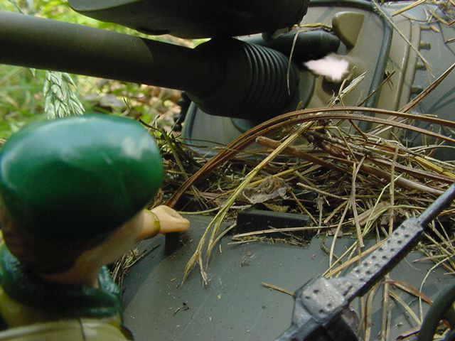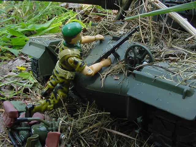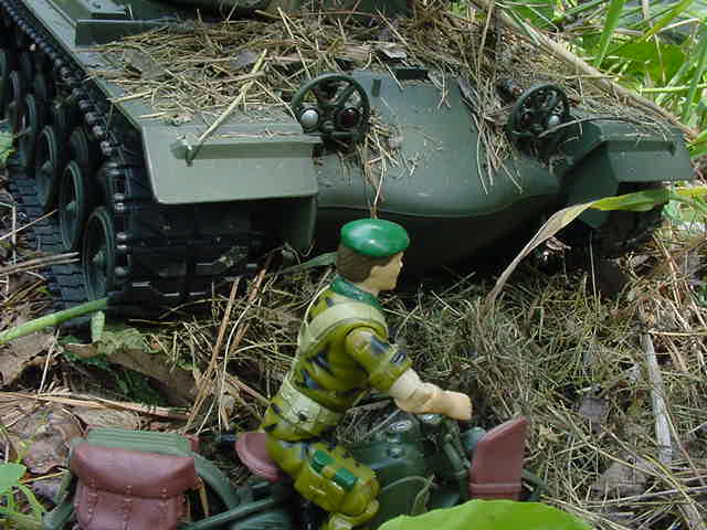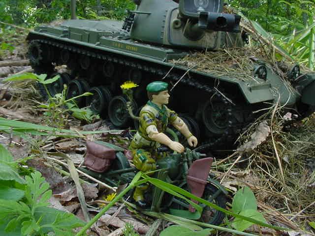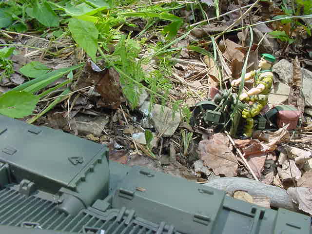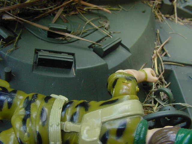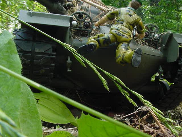 P81. Kai-"Boss the Ally ends here" Wang-" Get back on the road then!" P82. "OK" VVVRRRROOOOMMM" P83. Bruce-"This is it!" VVVRRROOOMMM. P84. CCCRRRRUUNNCCHH P85. While the driver is blinded by the roof Bruce comes it P86. VVVVRRRROOOMMM P87. He gets closer VVVRRROOOMMM. P88. VVVRRROOOMMM Bruce-"AAAAAAAAHHHHHHHHHHH" P89. The hut's roof finally falls off. Kai-"Crazy Yankee on font of us!" Wang-"Run Him Down!!" VVVRRROOOMMM Bruce-"AAAAAAAHHHHHHH" P90. Bruce grabs his gun and leaps off his bike and lands on the front of the M48. P91. Kai-" Boss He's on the front!" P92.