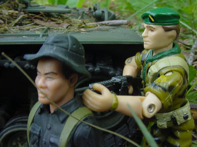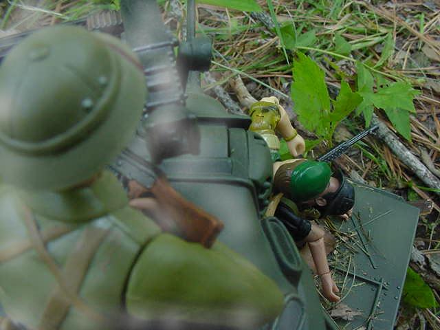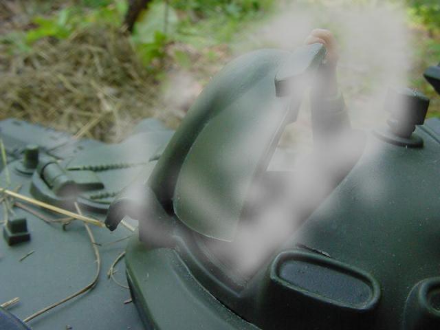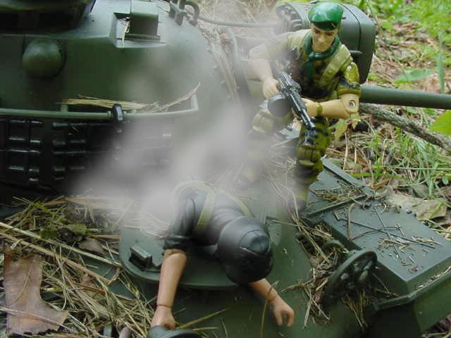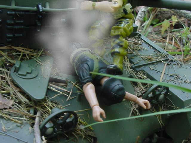 off! P105. The Steel beast finally stops. P106. Bruce makes his way closer to the driver hatch while CO2 gas leaks out of the hatch PSSSSSSSSS P107 The hatch opens and Kai slumps out gasping for air while Fire Extinguisher smoke goes everywhere. COUGH COUGH..... P108. But Bruce quickly Sedates him Bruce-"UH That was for the Bull Dog!" P109. Bruce-"Don't $%^#@& move Charlie!!" P110. But meanwhile on the top of the turret.. PPPRRRRRSSHHHH P111. ECH ECH ECH... P112. Wang-"You Pay for this Yankee!"